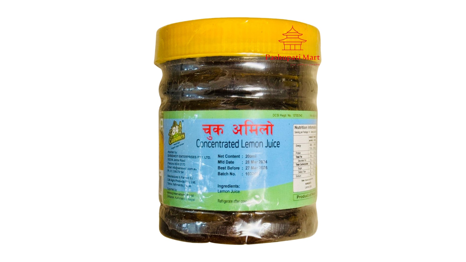 Introducing Chuk Amilo Concentrated Lemon Juice, a product of Nepal brought to you by Pashupati Mart. This concentrated juice offers the refreshing taste of lemon in every drop. Made with the finest ingredients, it provides a tangy zest to your beverages and dishes. Elevate your culinary experience with our Concentrated Lemon Juice.